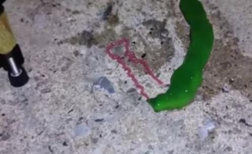 extraño gusano verde, con un gran apéndice rosa, al parecer una lengua, esta